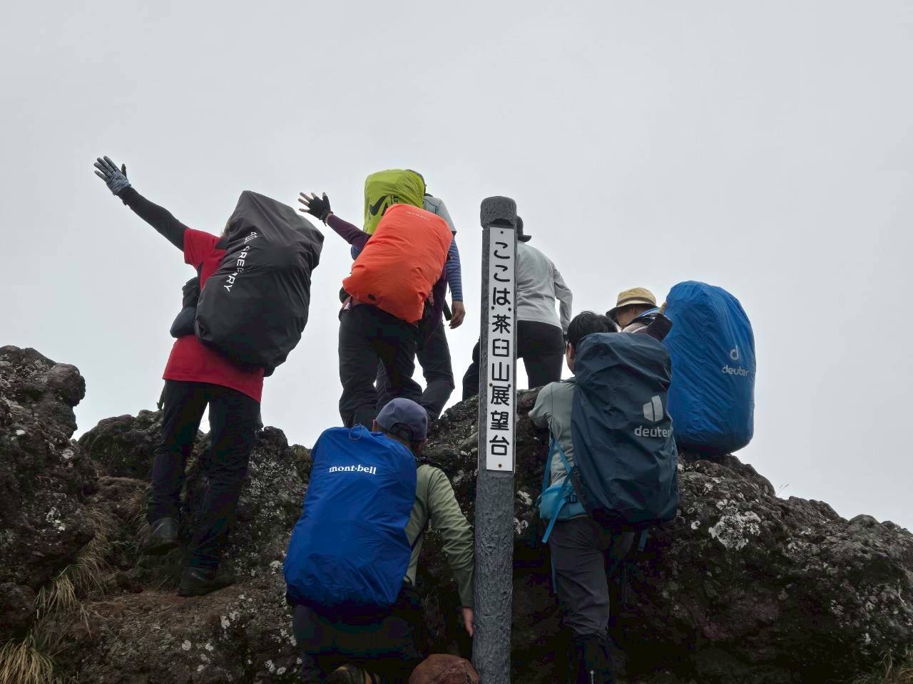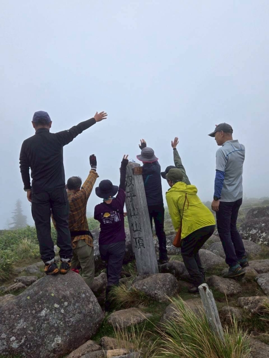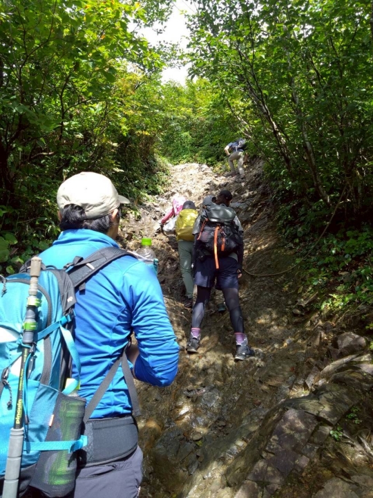 登山口脇の祠に「無事帰ってこれますように」とお参りをし、登山開始。急登が続き岩場、鎖場を上り2合目に到着。登りがきつく、猛暑で汗だくである。まだまだ、標高1,400mは登らなくてはいけない。頂上にたどり着けるのだろうか不安がよぎる。急傾斜を登り続け5合目となる日向山へ到着。昼食をとりエネルギーを補給し再出発。6合目までは、勾配が緩やかで雪渓を超えると池塘がありミズバショウが疲れた心と体を癒やしてくれる。6合目からはまた急登が続く。時折、荒沢岳、巻機山が見えるが、傾斜がきつくゆっくり眺めている余裕がない。暑さと疲れがピークのときに雹混じりの恵みの雨が降り、一気に気温が下がり少し元気が回復。9合目からは、偽ピークを3つくらい越えやっと頂上へ。八海山を背に写真をとり避難小屋へ。避難小屋では、千葉県から来たご夫婦と楽しく談話をし、明日への英気を養いました。