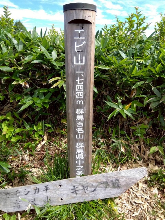 次の目的地を目指して笹原を下り終わると、平坦な登りが始まり一部急な登りと変化にとんだルートを歩き,群馬100名山のエビ山(1744m)に到着しました。