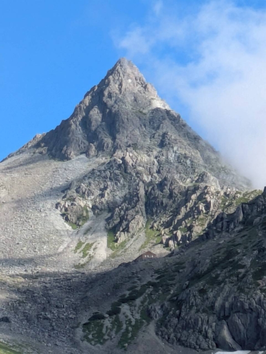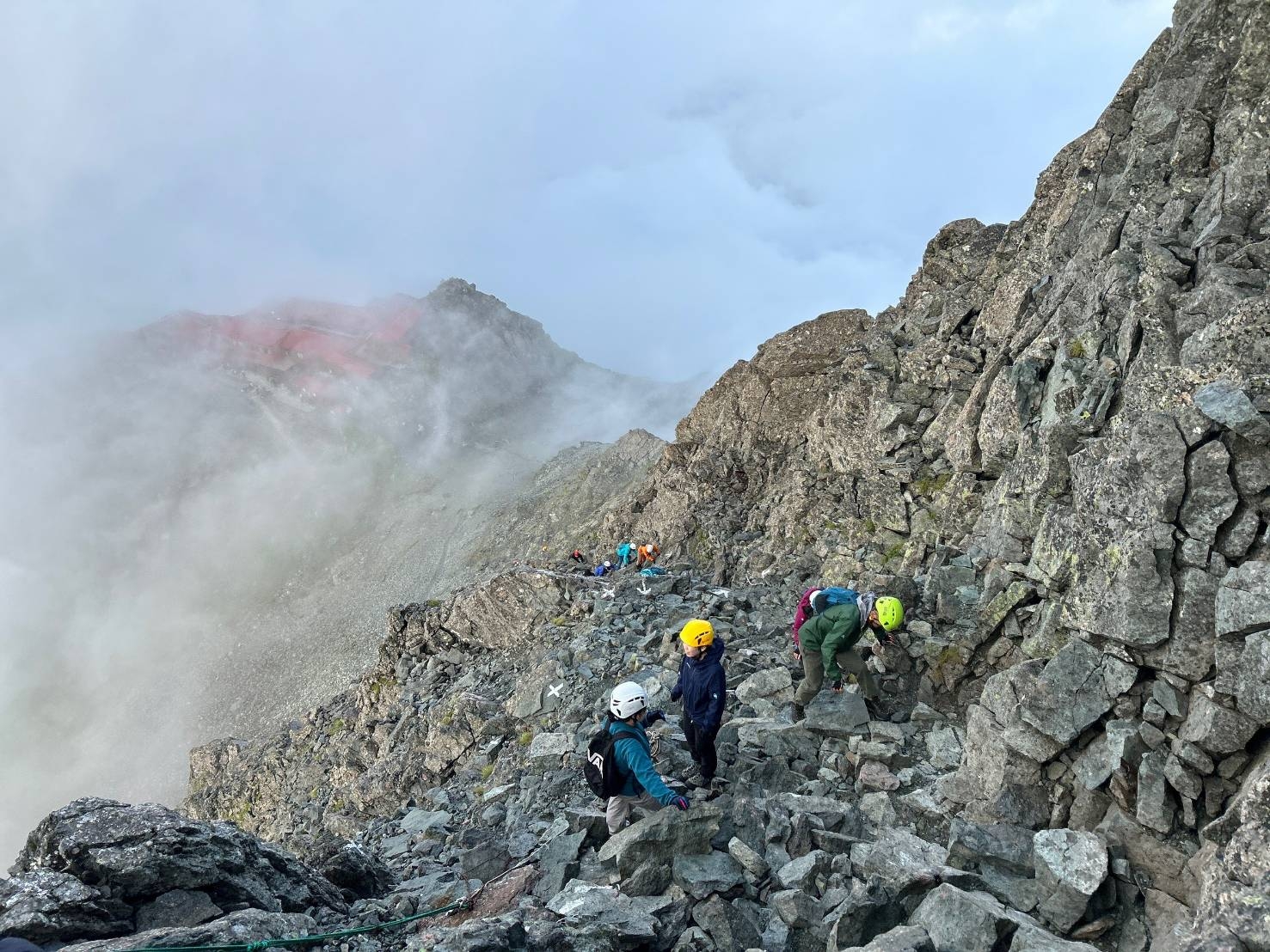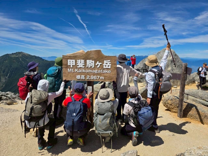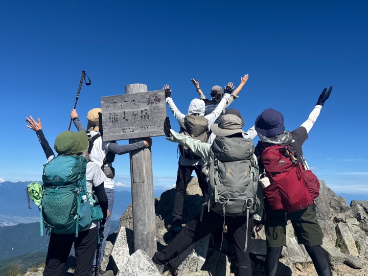 小屋に着くと荷物をデポして新山へ。大きな岩々を乗り越え、狭い山頂で記念撮影。