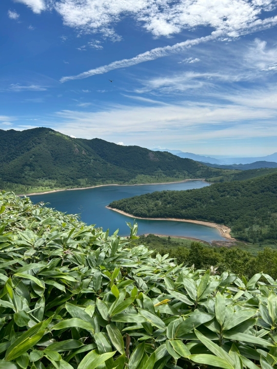 右下に見える、野反湖に向かい進んでいくと綺麗な芝生、キャンプ場、炊事場、トイレが整備されていました。2組がテント泊利用していました。少し早めの昼食を取り、湖畔の平坦な笹原の中を出発しました。湖面には水鏡となった風景がキラキラと輝いていました。