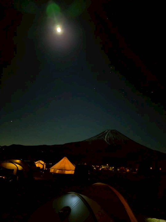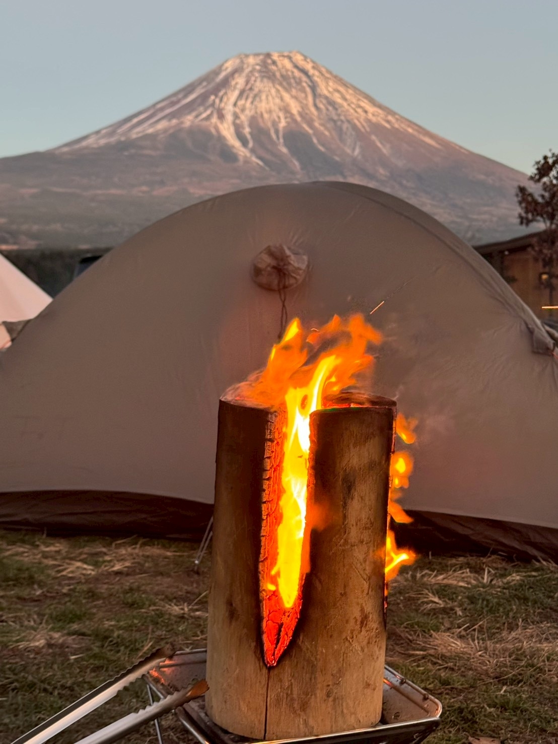 下山後は ふもとっぱらキャンプ場 へ。広大な草原と、その向こうにそびえる富士山。テントを張るだけで特別な時間が始まります。夕暮れの赤富士から夜の星空まで、贅沢な景色を眺めながら皆で酒を飲みながら一夜を過ごしました。(気温は氷点下、凄く寒い)