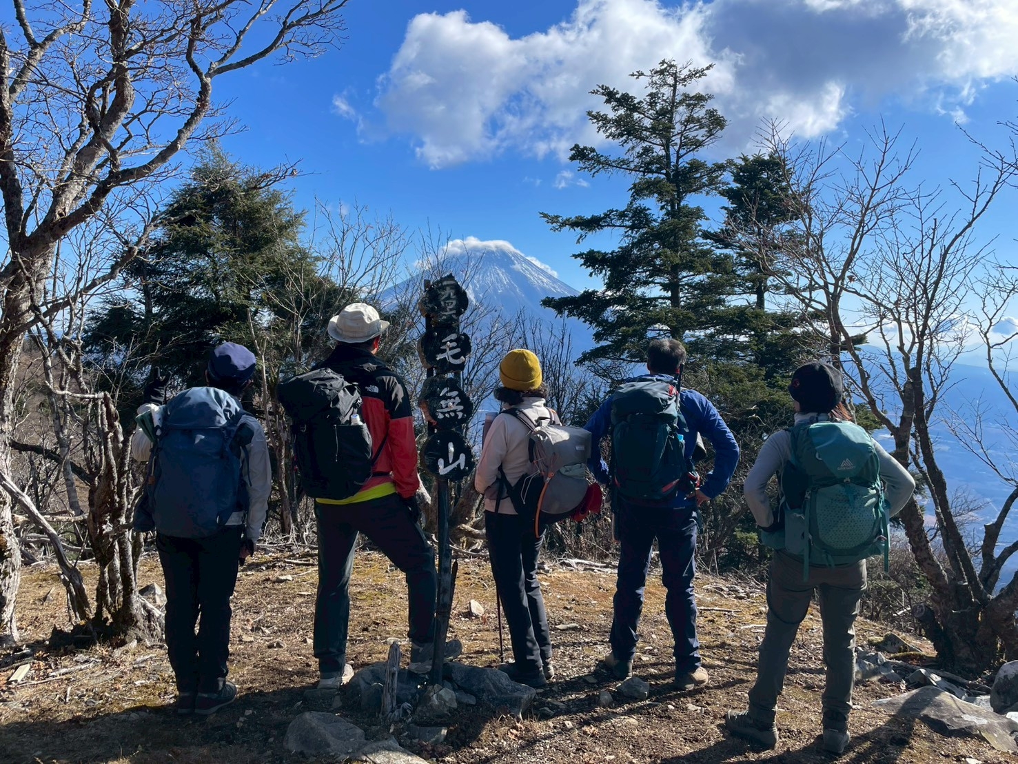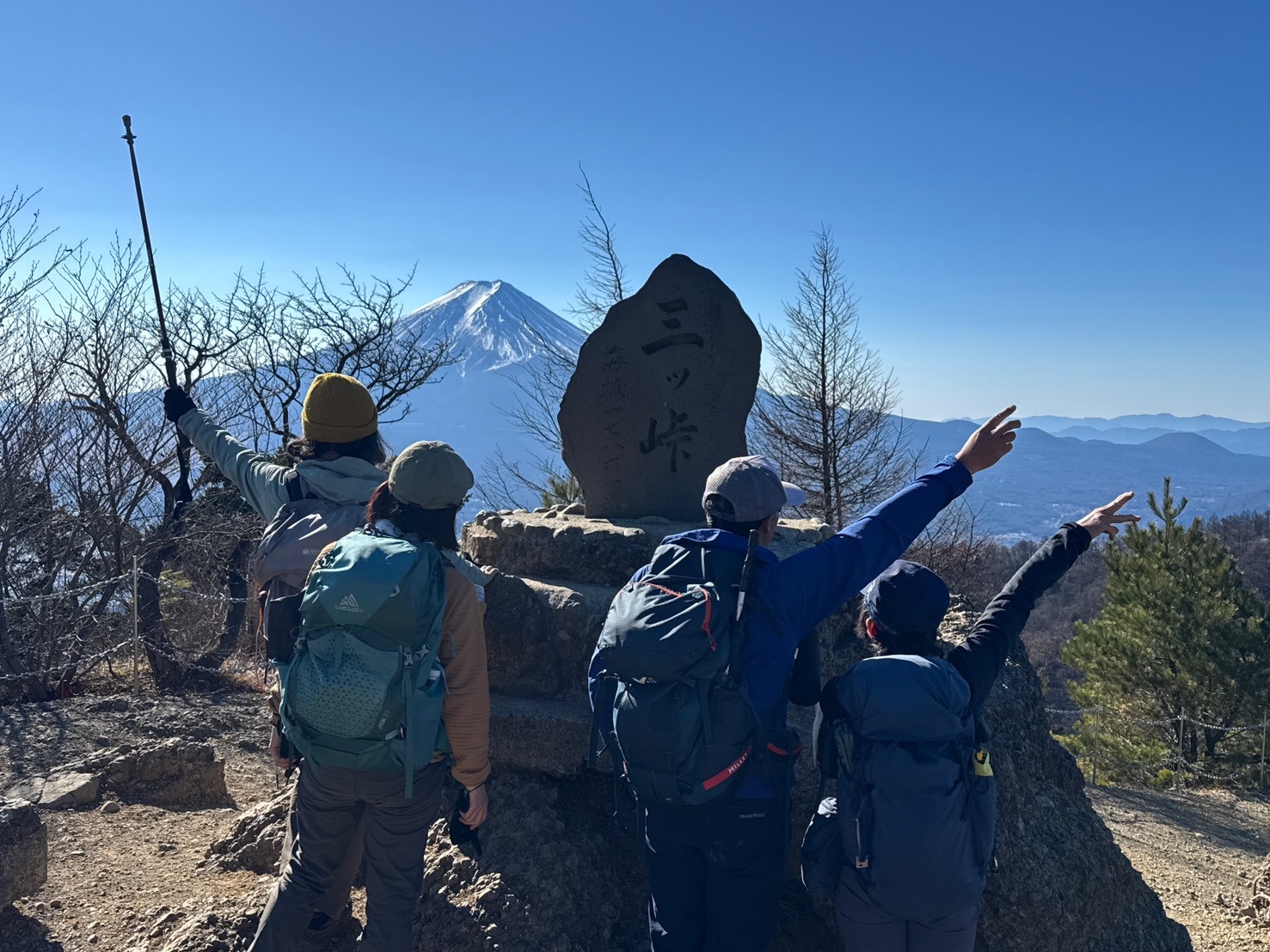 徐々に高度を上げていくと視界が開け、再び富士山が大きく姿を現します。三ツ峠山は岩場や展望スポットが点在し、飽きることのない登りでした。山頂から望む富士山はまさに圧巻。