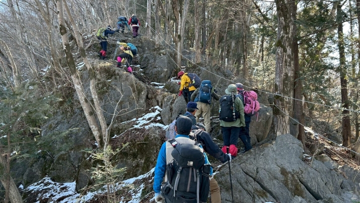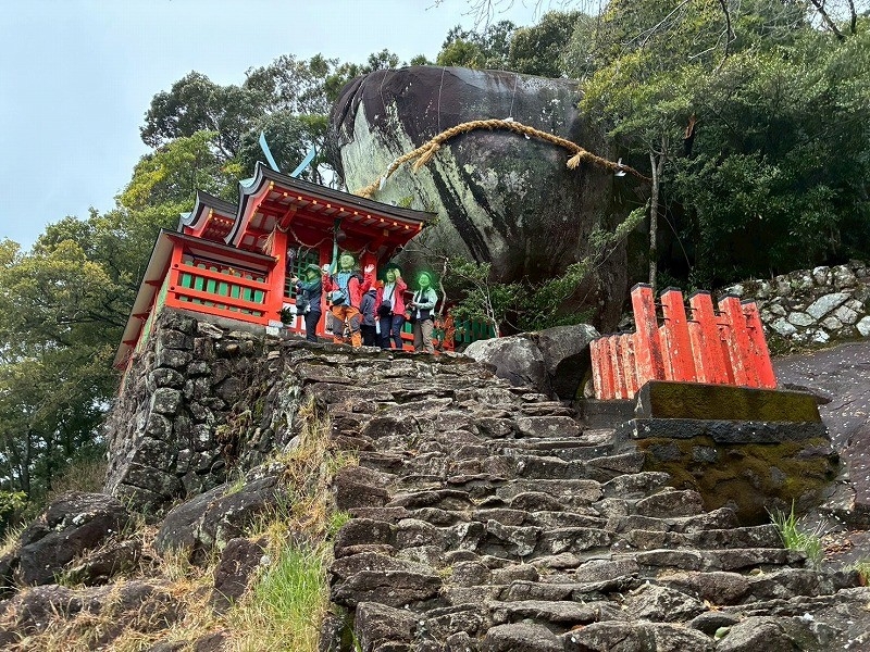 ・Sイさん:憧れの熊野古道に行けるわくわくとこんな重い荷物を背負って、最後まで歩けるのか不安を抱えながら参加しました。初めての夜行バス、4日間連続の夕食のお酒、心はホッコリ、身体はぷっくりしてしまいました。一番印象的だったのは、神倉神社の御神体巨大なゴトビキ岩とそこに通じる参道の石段です。500段以上もあり、急坂で立派な石が積み上げられていました。押印帳片手に王子巡り、八咫烏、大斎原、那智の滝、大門坂、那智の大楠の胎内くぐり、初日の宿の印象的なご主人等など 思い出たくさんもらいました。